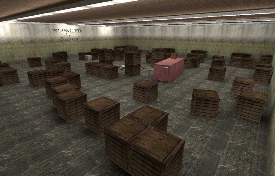Закрытая карта, с голыми стенами и на земле стоять деревянные ящики, за которыми легко можно укрыться. Небольшая и простая карта aim_ для игры CSS v34.