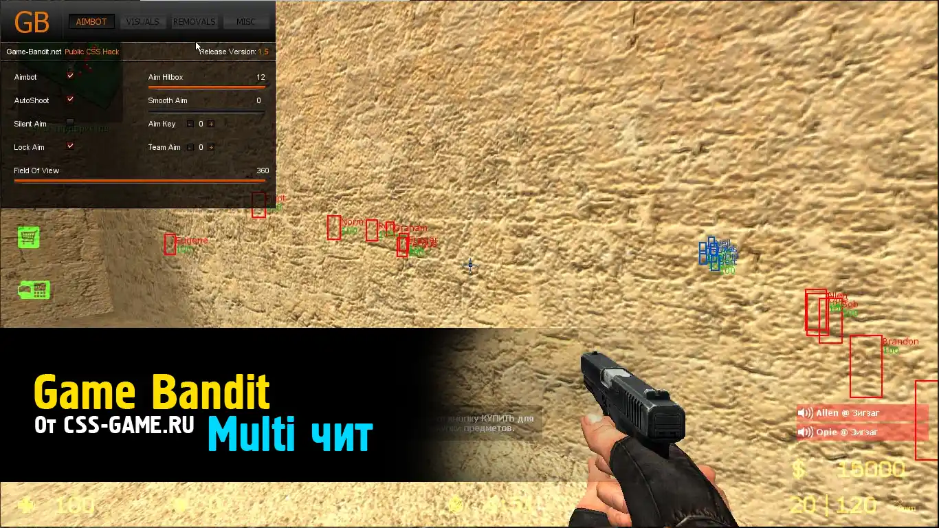 Game Bandit - это многофункциональный чит, в котором набито множество функций и который решает за вас вопросы об убийстве. В этом чите вы найдете такие модули: Aimbot, SpeedHack, ESP, BunnyHop, AutoShoot, SilentAim, No Flash, NoRecoil, NoSpread. В игре вы также можете настроить режим без пальцев, который вам совсем немного поможет, не замечая других игроков, как вы активно его используете.